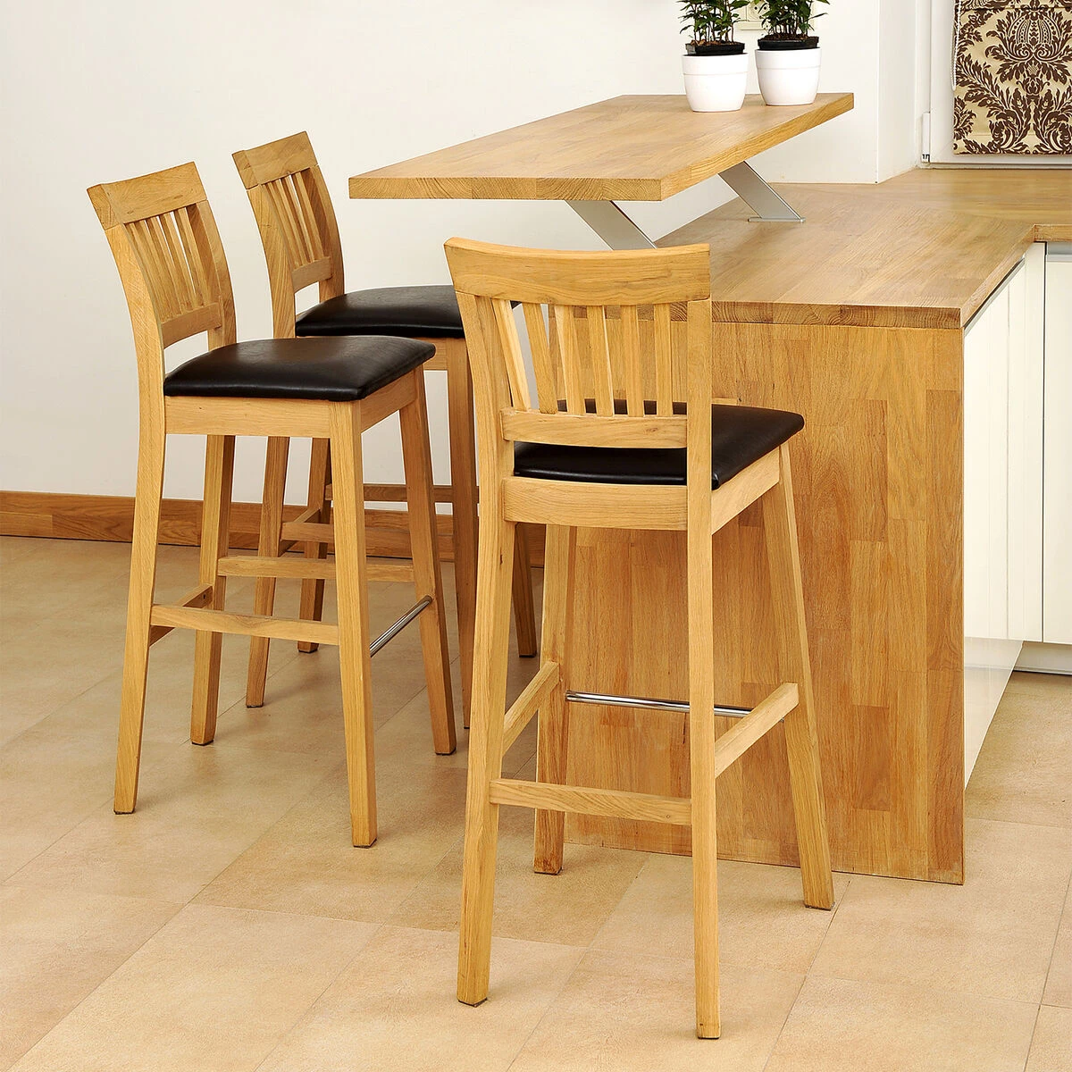 Trendikäs Sandi baarituolisetti pehmustetulla ja keinonahkaverhoilulla istuimella.