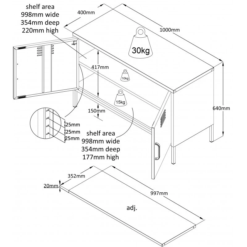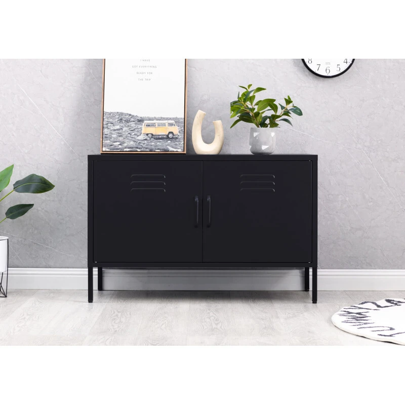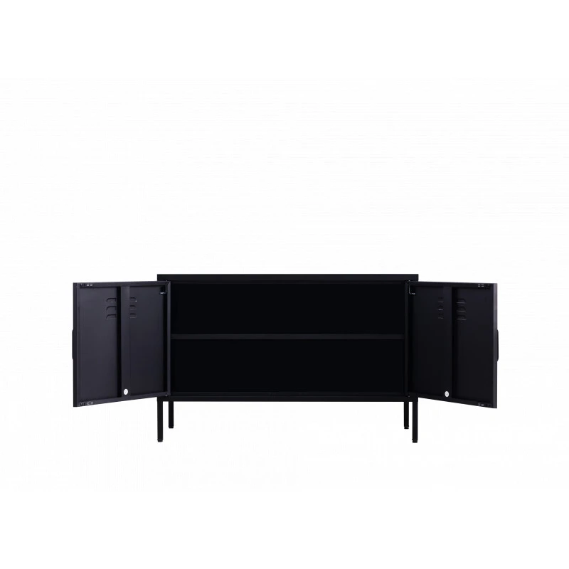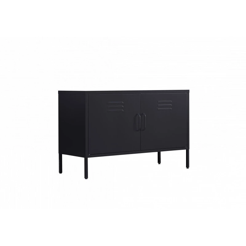 Tyylikäs metallinen Carbon tv-taso kahdella ovella. Ovien takana on yksi korkeussäädettävä hylly.