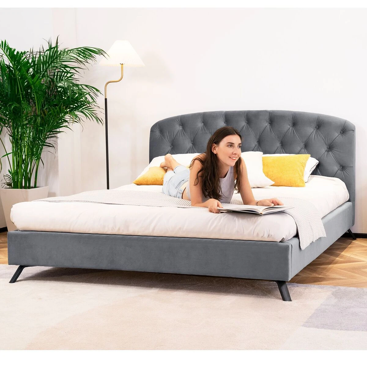 Kevyesti pehmustettu Aurora divaanisänky pehmeällä samettikangasverhoilulla.