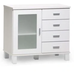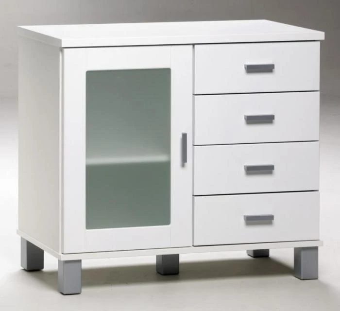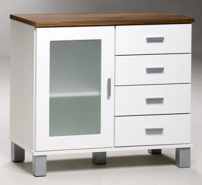 Korkealaatuisen Fondi-tuotesarjan lasiovilipasto neljällä vetolaatikolla ja lasiovikaapilla. Voit valita oveen kirkkaan lasin tai maitolasin.