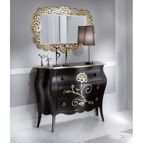 La Casa-tuotesarjan todella tyylikäs lipasto moneen eri käyttöön. Lipastossa on kolme tilavaa vetolaatikkoa ja kauniit koristeelliset metallivetimet. Valmistettu massiivipuusta ja kalustelevystä. Laatikoston etureunassa on kaunis kullanvärinen ruusukuvio.