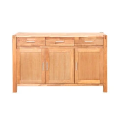 Trendikäs tammiviilutettu lipasto kolmella ovikaapilla ja kolmella vetolaatikolla.