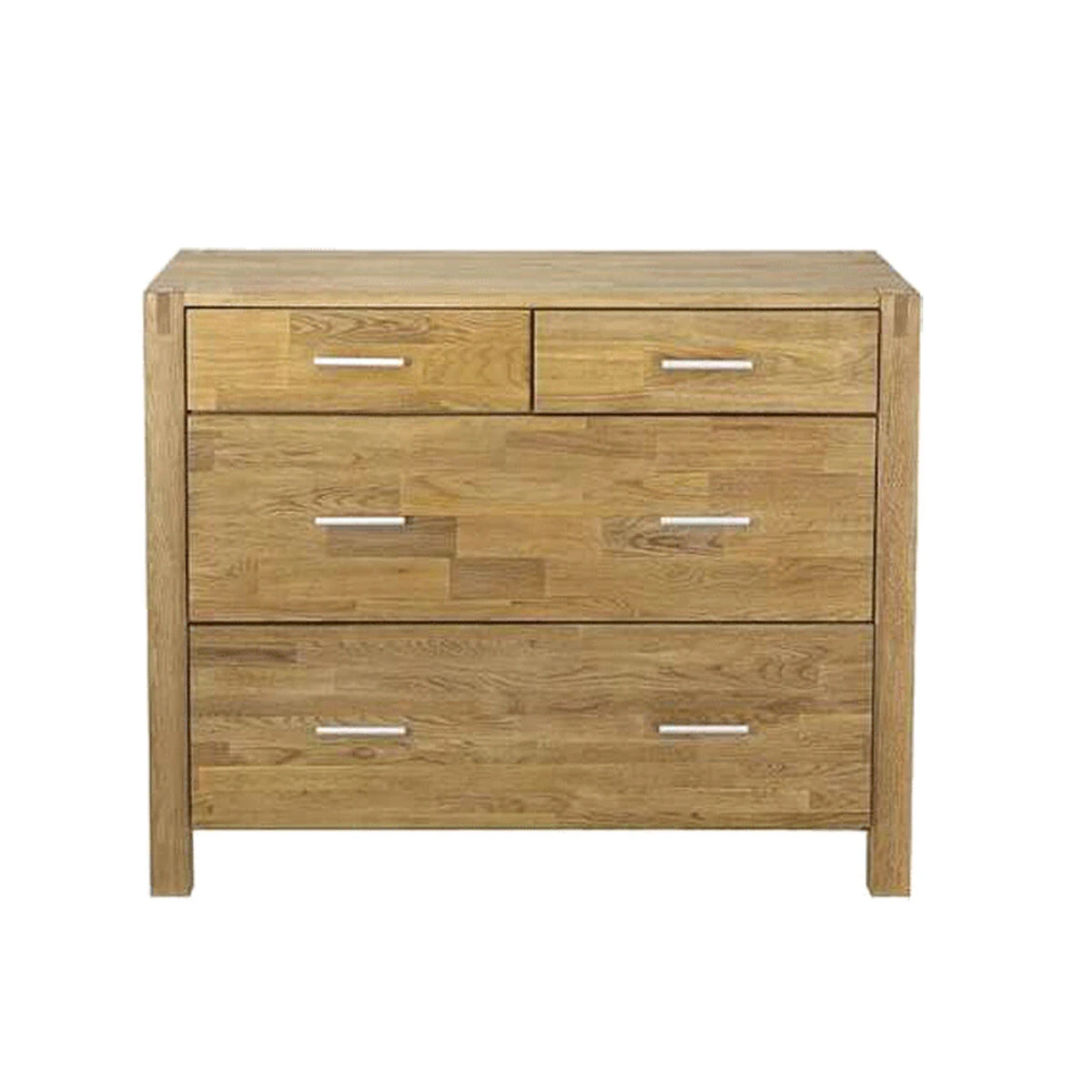 Käytännöllinen tammiviilutettu lipasto neljällä vetolaatikolla.