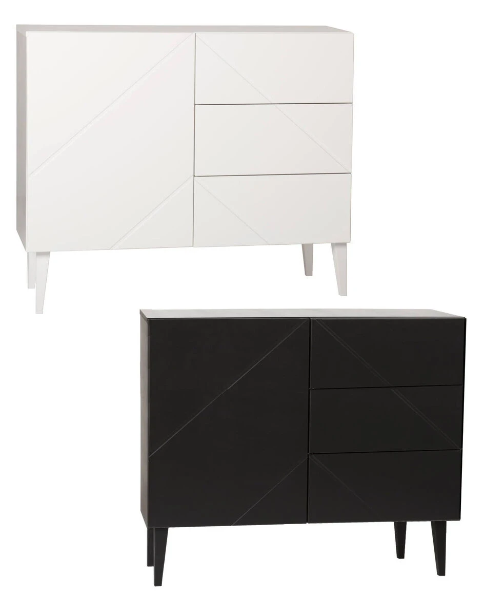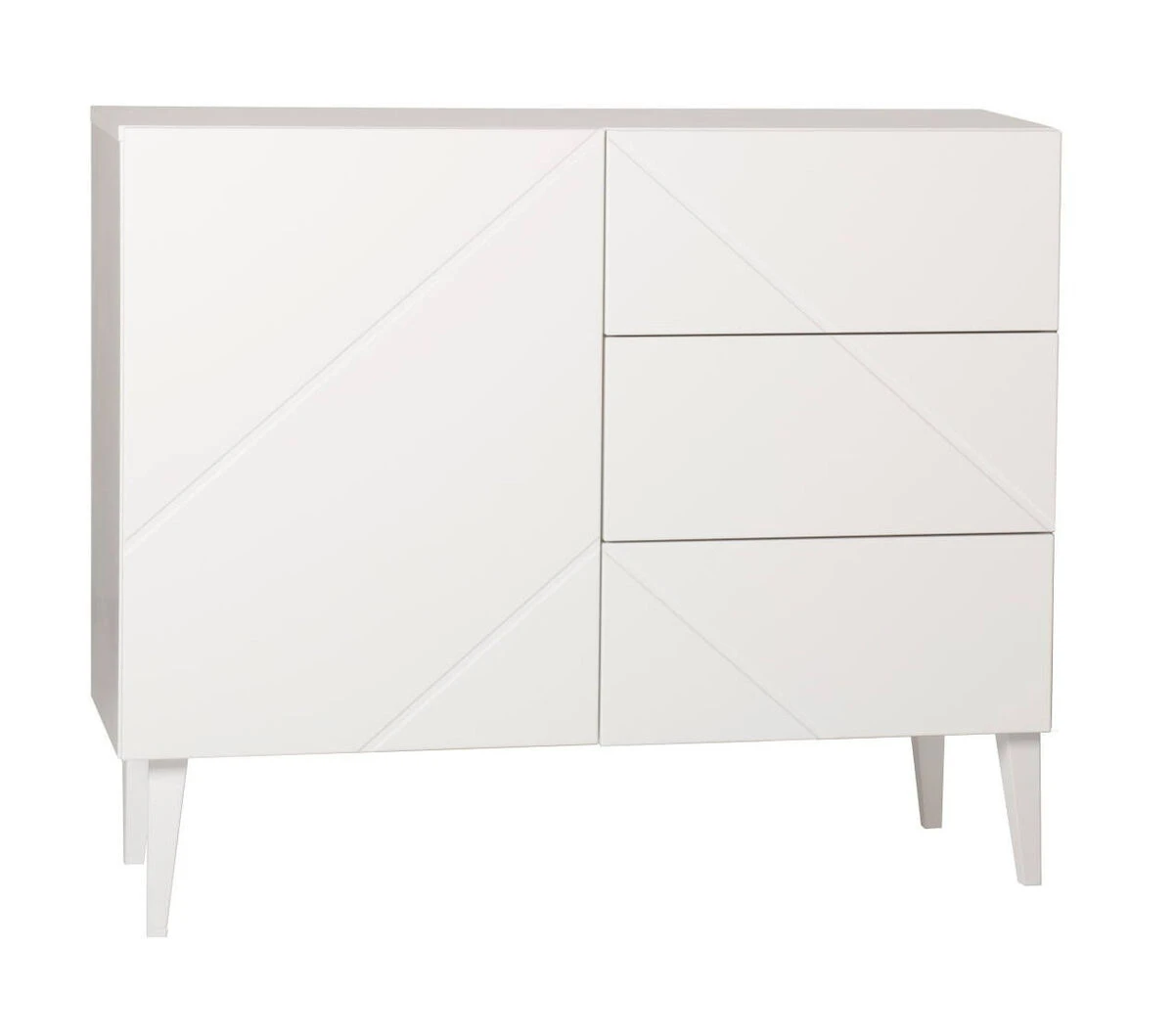 100 cm leveässä Vilja lipastossa on yksi umpiovikaappi välihyllyllä sekä 3 kpl tilavia vetolaatikoita.