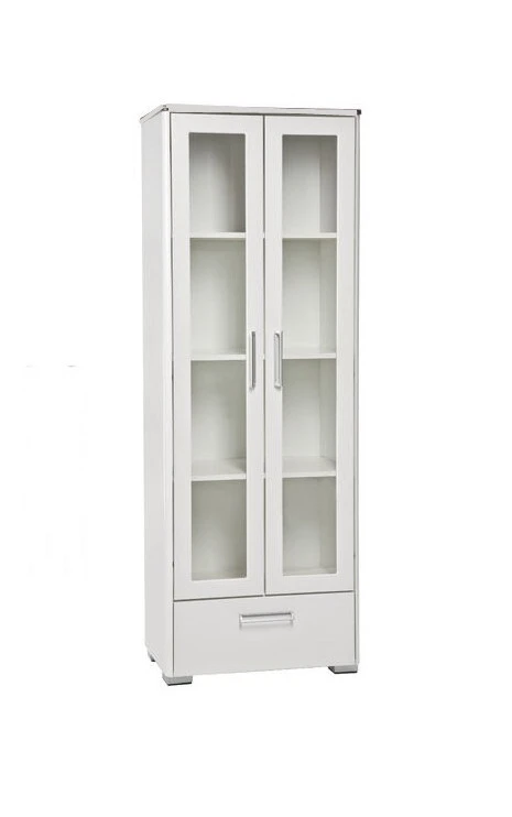 Kotimaisessa Helmi-vitriinissä on 2 lasiovea ja alhaalla 1 tilava vetolaatikko. Vitriinin sisällä on 4 välihyllyä.