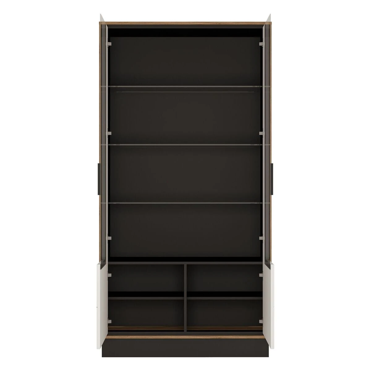 Huipputyylikäs Palermo tuotesarjan vitriini kahdella lasiovella ja lasihyllyillä. Tuotesarjaa koristaa kauniit abstaktit koristekuvioinnit.