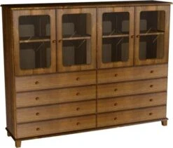 Ruska kaapistossa on neljä lasiovikaappia ja kahdeksan vetolaatikkoa. Kaapeissa on välihyllyt.