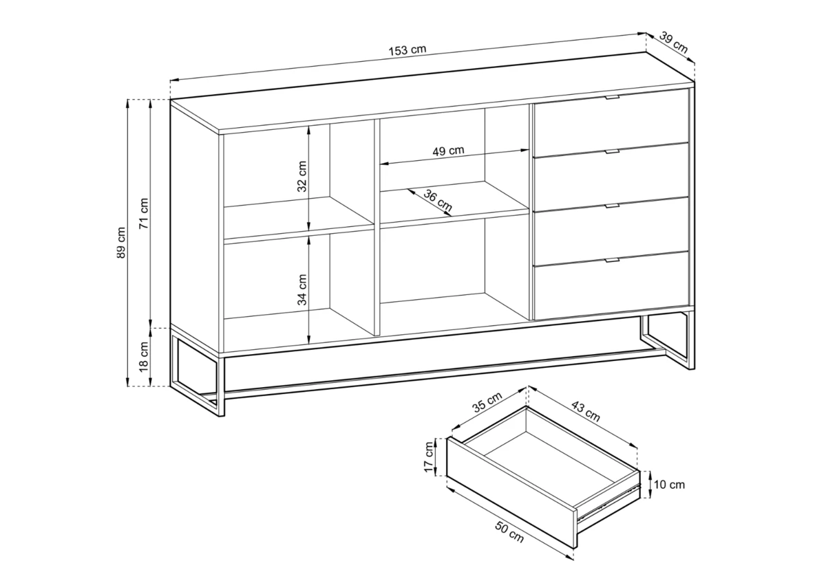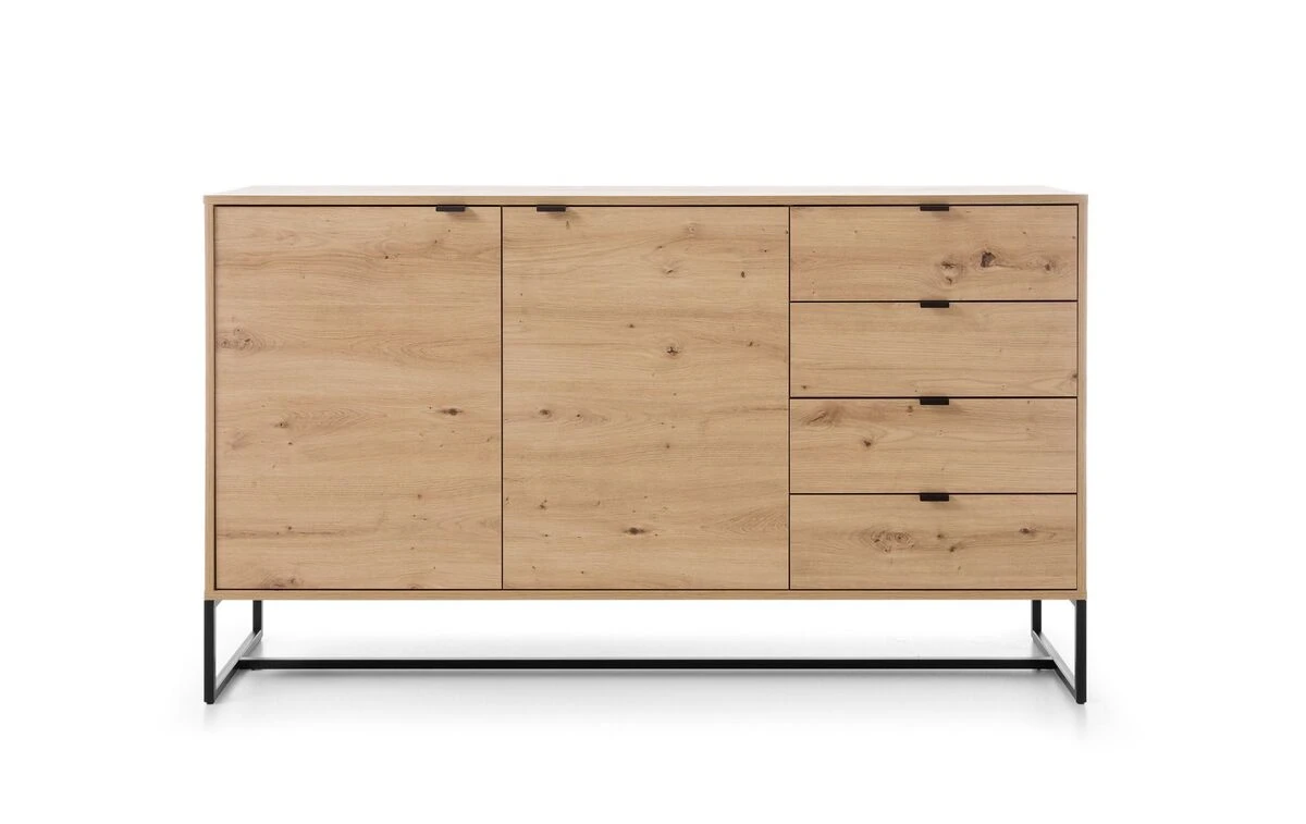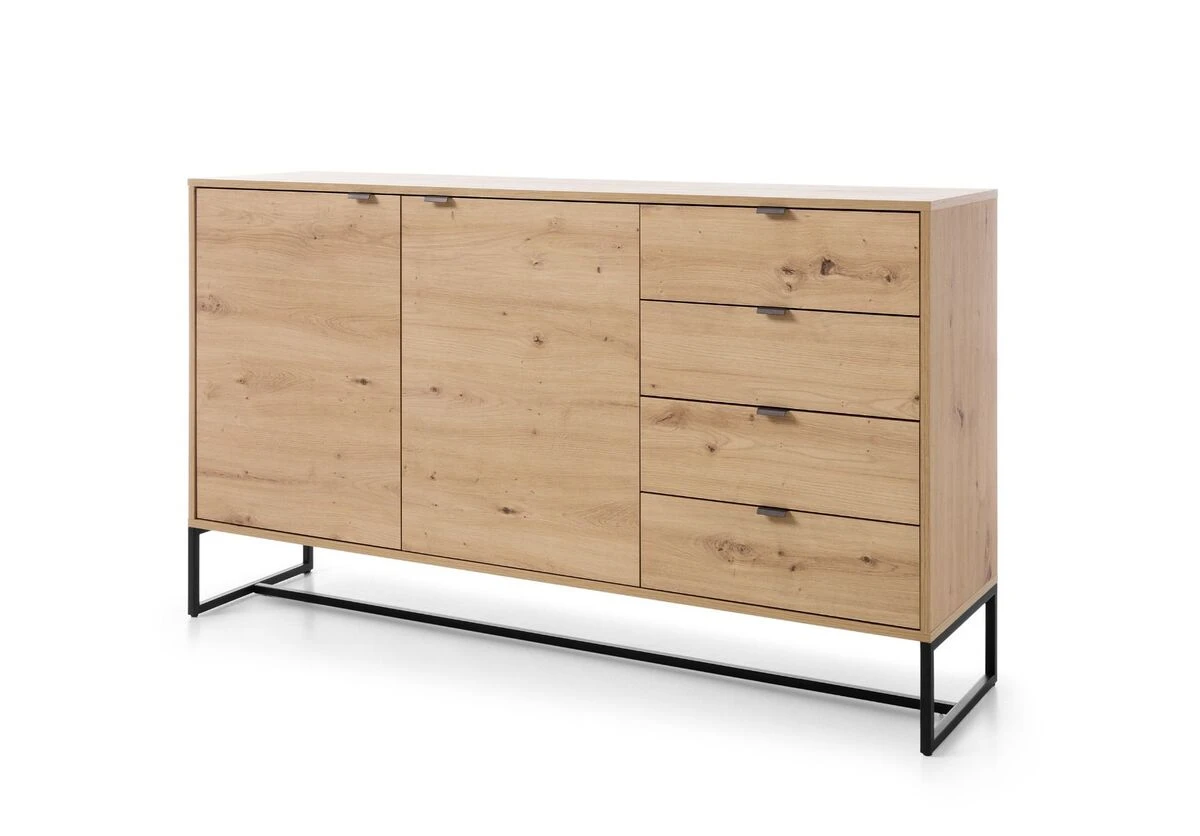 Tyylikäs tammen värinen Fore-senkki. Senkissä on 16 mm laminoitu kalustelevyrunko, ABS-reunanauha, mustat metallijalat sekä mustat metallivetimet. Senkki sisältää neljä vetolaatikkoa sekä kaksi kaappia, joissa molemmissa on välihylly.