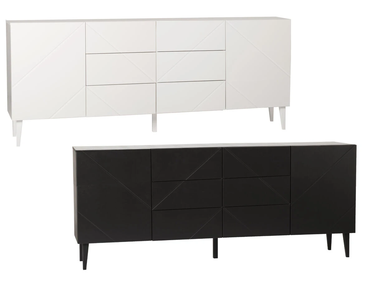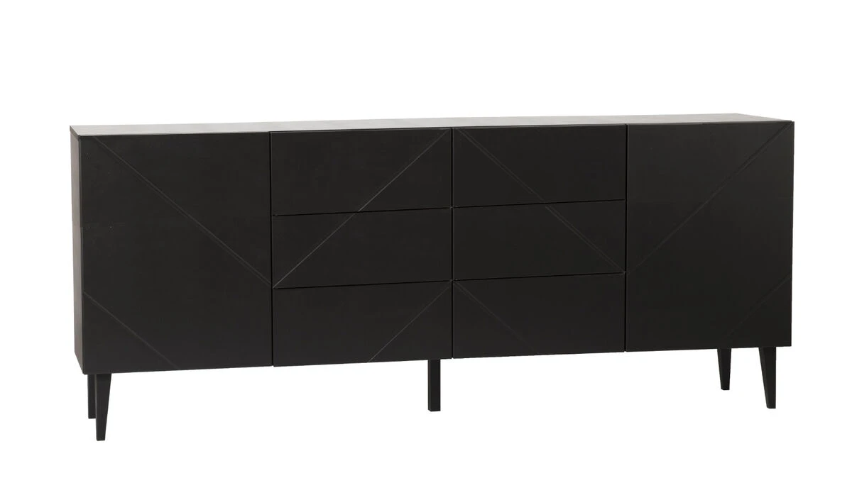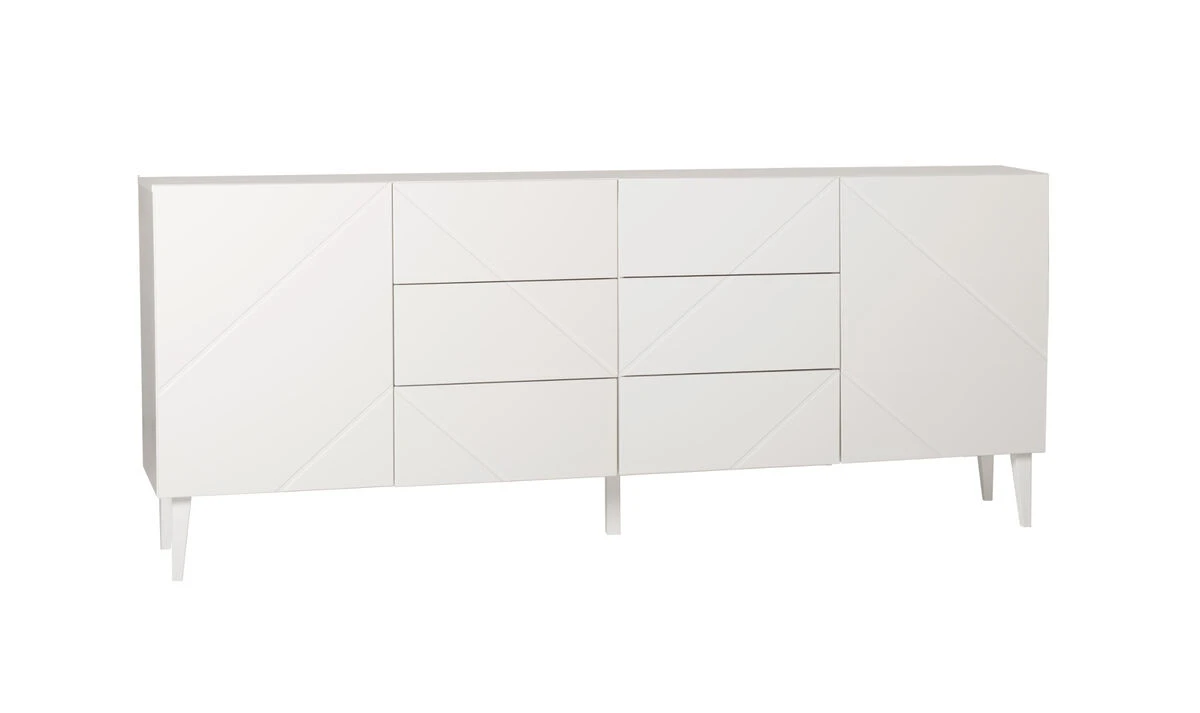 200 cm leveässä Vilja senkissä on 2 umpiovikaappia välihyllyillä sekä 6 vetolaatikkoa.