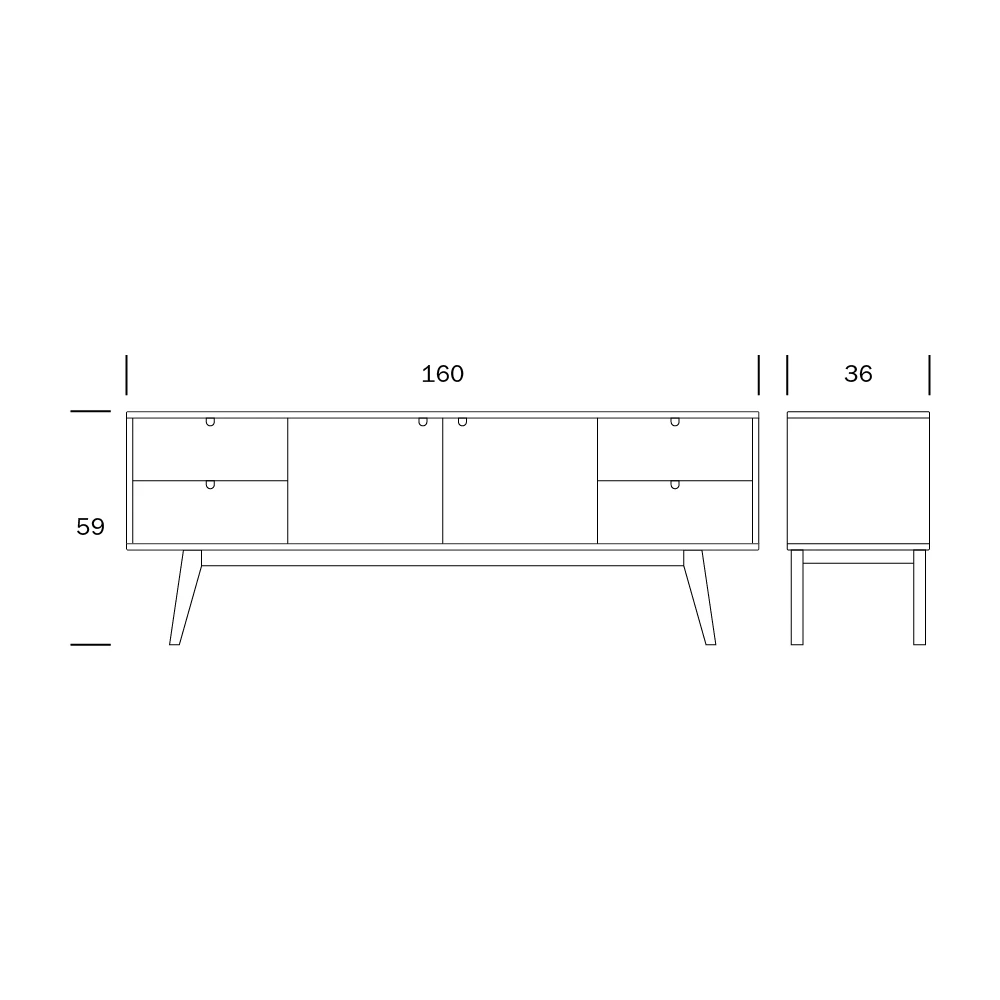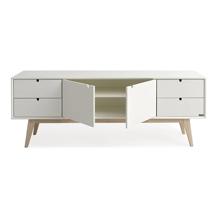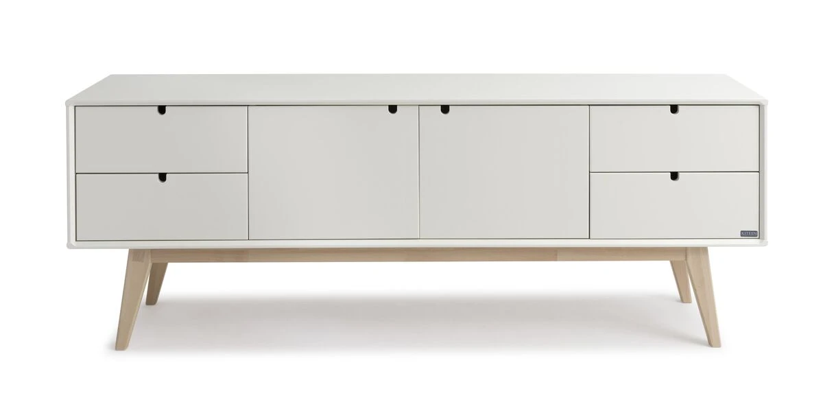 Kevyt ja kaunis, kotimainen kokokoivuinen tv-taso kahdella ovikaapilla ja neljällä vetolaatikolla.