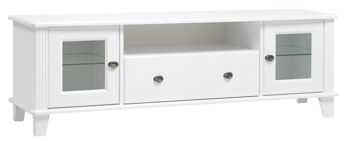 Kotimainen Rosa tuotesarjan kaunis ja laadukas tv-taso kahdella lasiovikaapilla ja vetolaatikolla.